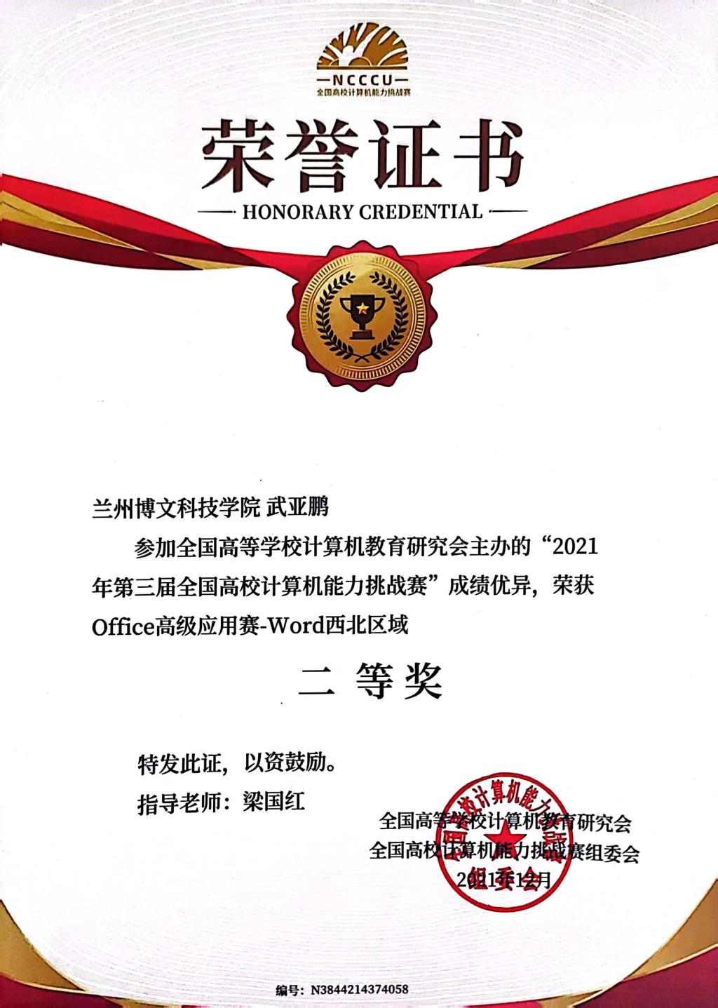 指导武亚鹏同学参加“2021年第三届全国高校计算机能力挑战赛”二等奖,秀指导老师;