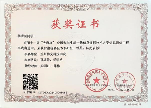 在“华为ICT”大赛2023-2024“”甘肃实践赛-网络赛道本科组中荣获优秀指导老师;