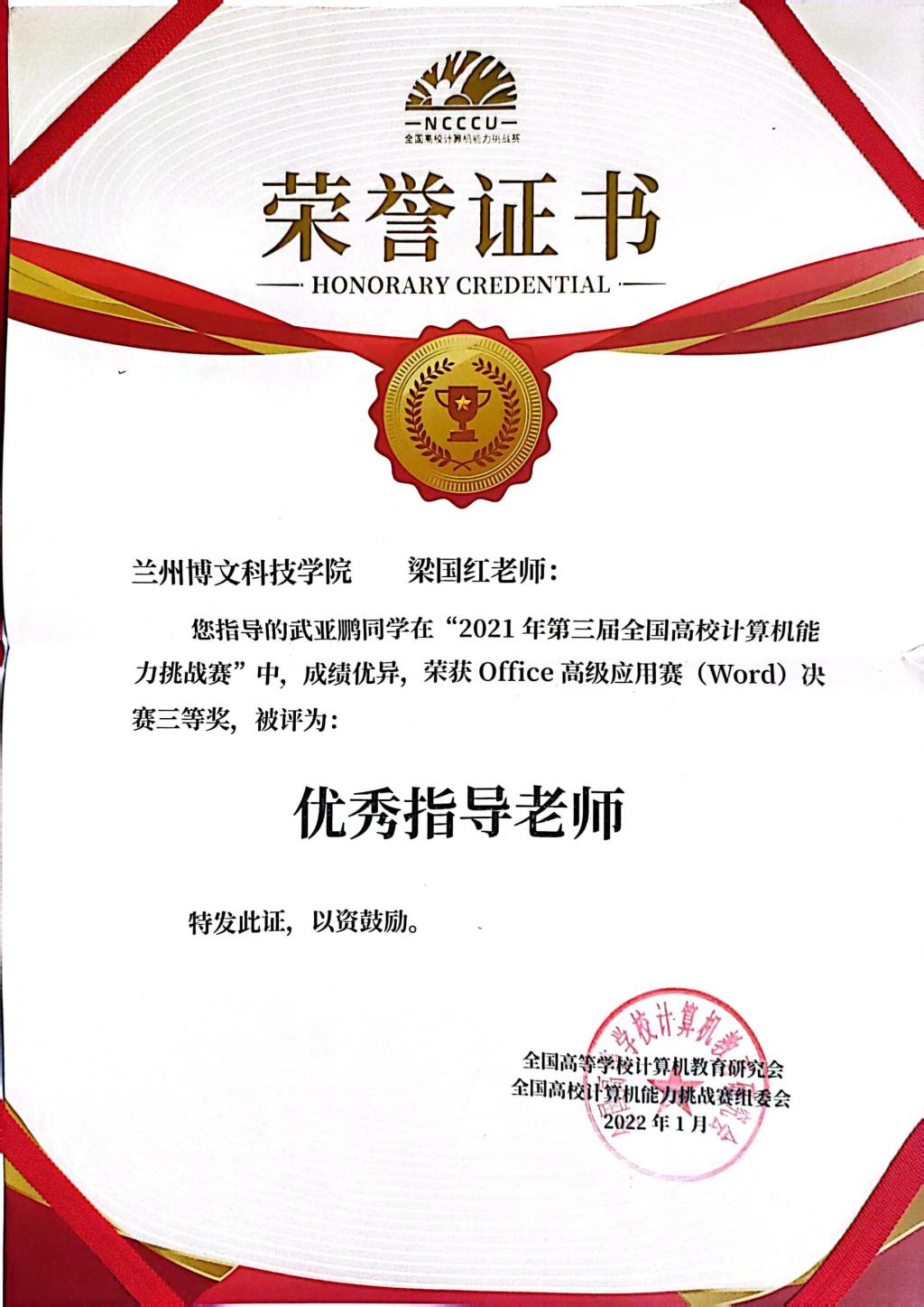 指导武亚鹏同学参加“2022年第三届全国高校计算机能力挑战赛”三等奖,优秀指导老师;