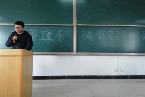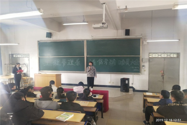 2019年12月18日12点40分兰州交通大学博文学院工程管理系在南校区教学楼西T4召开2019-2020学年第一学期诚信考试动员大会,旨在倡导学生文明考试,加强我系学风建设。大会首先由学生代表苏宸发言,表达学生积极备考,诚信考试,考出真实水平的强烈愿望。接着由教师代表给排水教研室主任丁红发言,代表全系教师表达认真监考,文明监考的决心。最后由教学副主任苟世霞老师做了大会总结,预祝全系学生考试顺利,考出优异的成绩。