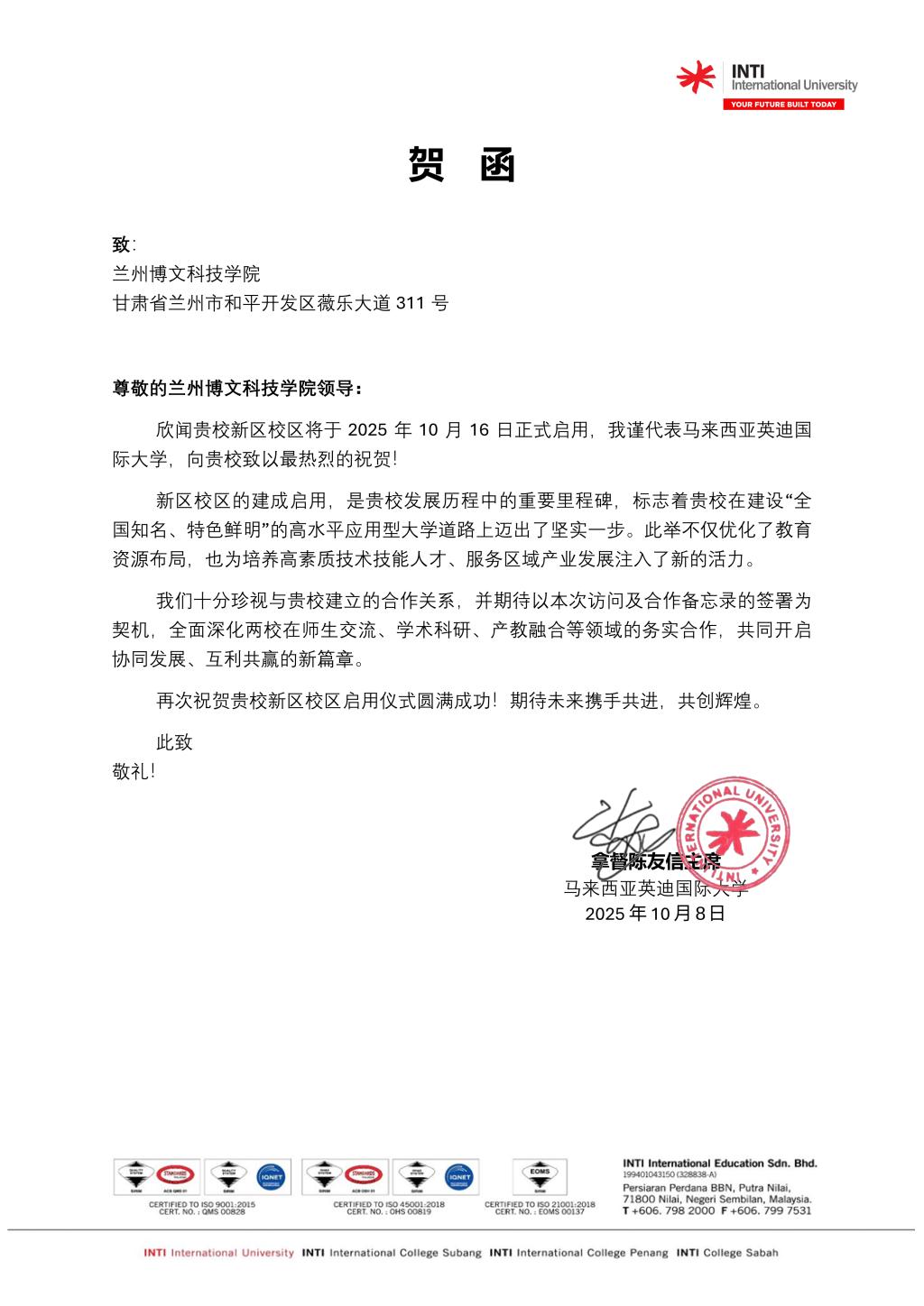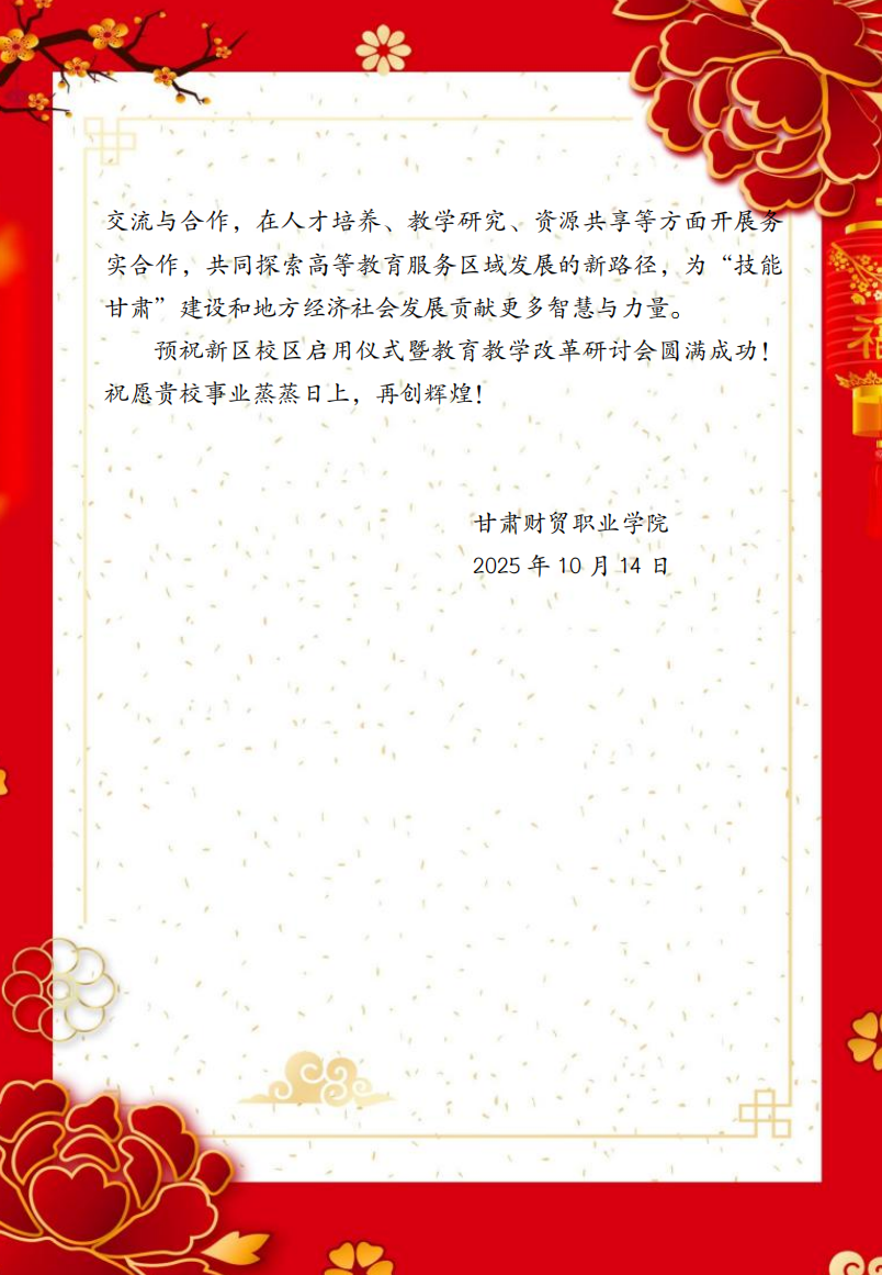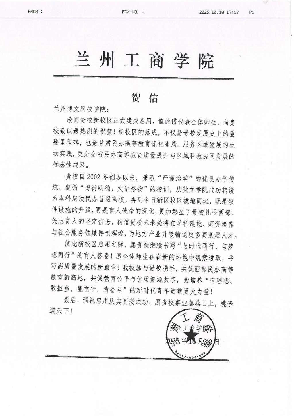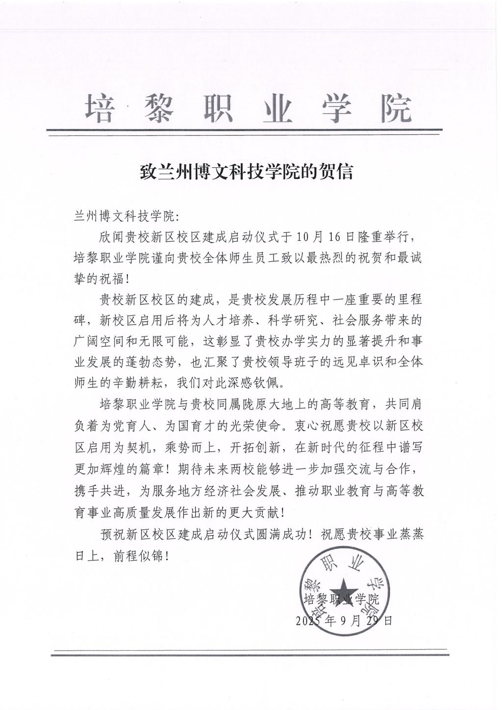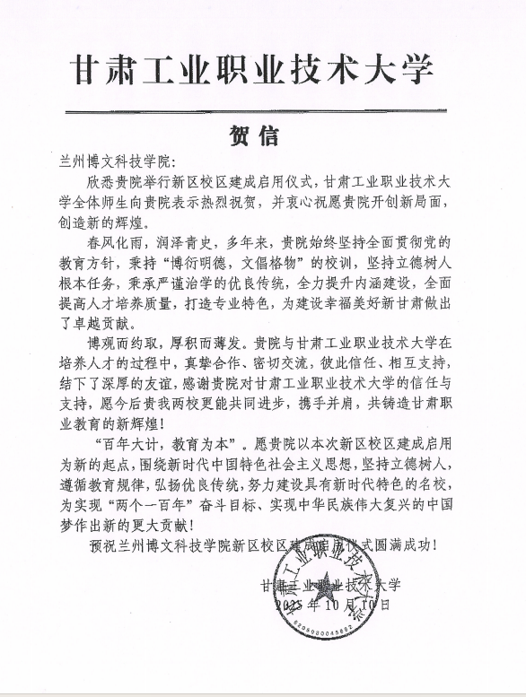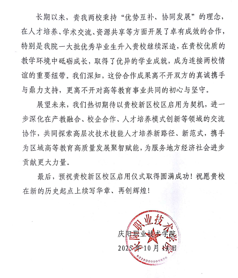 各高校在贺信中一致表达了对BEAT365官网新区校区顺利启用的热烈祝贺与美好祝愿。各高校均期待以此为契机,未来能在学科建设、人才培养及科研创新等领域,与BEAT365官网进一步深化交流,拓展合作空间,携手为高等教育事业的高质量发展贡献力量。