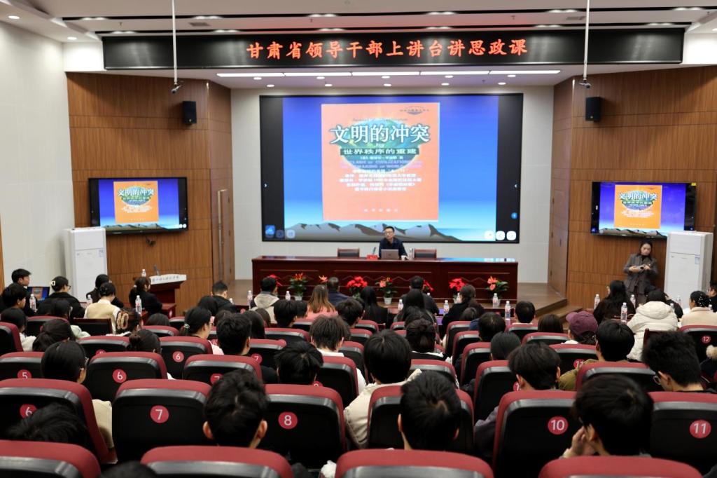 为深入贯彻落实习近平总书记关于学校思政课建设的重要指示精神,根据省委教育工委统一安排,11月14日上午,学校在北校区综合教学楼12楼报告厅举办“甘肃省领导干部上讲台讲思政课”系列活动。甘肃省文联党组书记、主席,省政协常委王登渤受邀担任主讲,学校党委书记阳红、各二级党组织书记、职能部处负责人、各学院教师代表共计200余人参加。