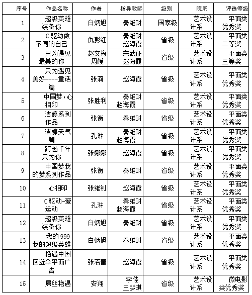 2015年艺术设计系积极组织全系师生参加第七届全国大学生广告艺术大赛。在学院和系领导的支持和关心下,组织3名青年教师参加了第七届全国大学生指导教师培训大会,在师生的共同努力下,参赛作品得到了专家的肯定,并取得了可喜的成绩。其中获得全国总决赛平面设计类1个奖项,西北赛区14个奖项。(详情见附表)