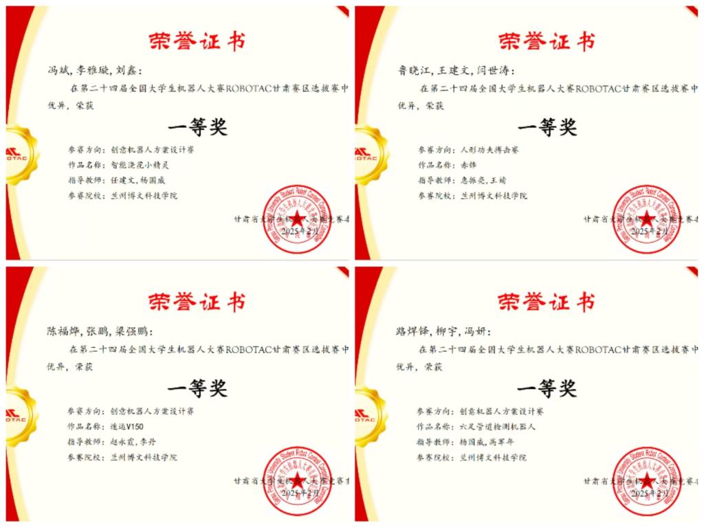 学生创新创业能力培养方面:学院积极引导学生开展第二课堂,根据学生的年级层次、兴趣爱好和能力特点,为学生提供了良好的实践学习环境。学生在各类学科竞赛中屡获佳绩,近三年获得省级及以上学科竞赛奖项100余项,其中包括等多项高水平奖项如:甘肃省第一届大学生机器人大赛暨第二十四届全国大学生机器人大赛ROBOTAC甘肃省赛、“挑战杯”甘肃省大学生课外学术作品竞赛一等奖、机械设计创新大赛省级二等奖等。