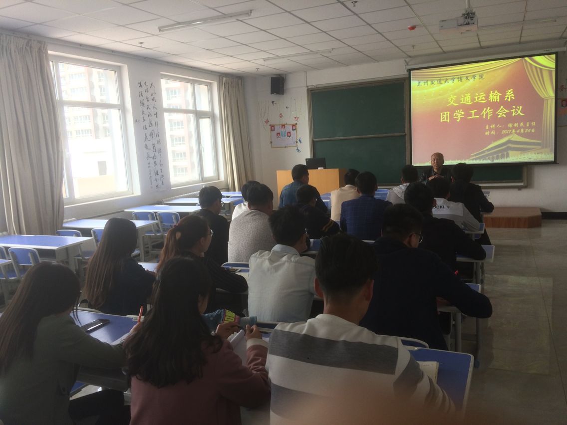 同心协力,追求卓越。交通运输系团学会于2017年4月24日16:30在北校区综合教学楼0706教室召开了团学会工作会议。出席本次会议的有团学会主席团全体成员及各个部门的部长,交通运输系谢利民主任也参加了这次会议。 系团学会对本学期前段工作进行了总结,各个部门也交流了以往的工作经验,并对今后的工作提出了设想。谢利民系主任认真听取了大家的发言,对系团学会前半学期的工作给予了充分的肯定,也指出了存在的问题,最后提出了建议和要求。他要系团学会要积极配合学院团学会和交通运输系的工作,做到事先有规划,工作有分工,事后有检查,总结经验,不断提高;要求各个部门工作人员在以后工作中要认真、负责,互相支持,共同努力。他还回顾了交通运输系第一届团学会的辉煌成绩,希望系团学会在今后的工作中,结合系工作重点,多组织和广泛动员全体同学参加集体活动,比如五月学院的运动会,要求在各个部门负责人的精密组织和积极带领下,争取在运动会各项比赛中取得优异的成绩。最后,还建议大家把握团学会这个平台,更好地提升自己,服务同学,为交通运输系的发展奉献自己的一份力量。