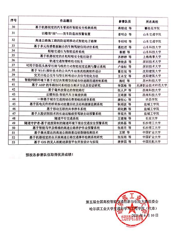 本次大赛通过初赛,共有哈尔滨工业大学、吉林大学、大连理工大学、华南理工大学等34所高校53支队伍进入全国总决赛。大赛以“智领交通·创想未来”为主题,聚焦“智慧交通”、“车路协同”、“自动驾驶”、“交通安全”,大赛通过初赛和决赛让更多的高校学生加入到智能交通事业中,融入交通强国战略中来。