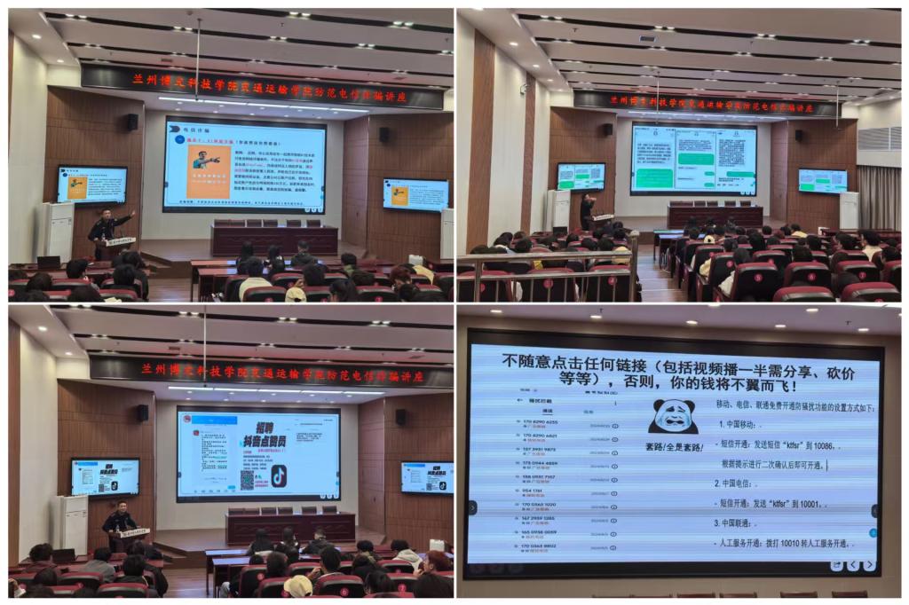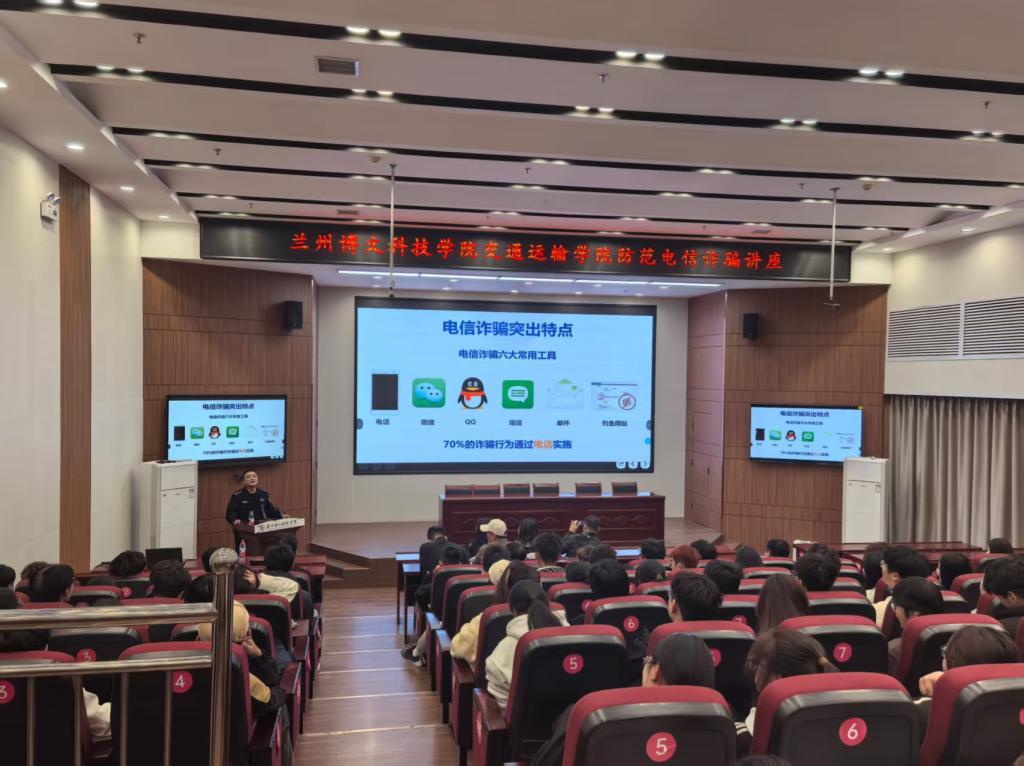 为切实提升大学生防诈反诈意识与自我保护能力,有效遏制校园诈骗案件高发态势,11月3日,交通运输学院特邀榆中县安局反诈中心主任陈冠宇警官,为全院师生带来了一场主题鲜明、内容详实的防诈骗专题讲座。学校保卫处处长王正茂、交通运输学院学生管理副院长、全体辅导员及2025届全体大一新生参加现场学习氛围浓厚。