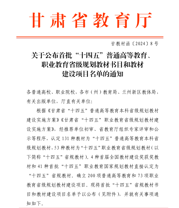 近日,甘肃省教育厅发布了《关于公布首批“十四五”普通高等教育、职业教育省级规划教材书目和教材建设项目名单的通知》(甘教材函〔2024〕8号),我校申报《工程招投标与合同管理》获批为十四五”普通高等教育本科省级规划教材建设项目的一个项目获批立项。