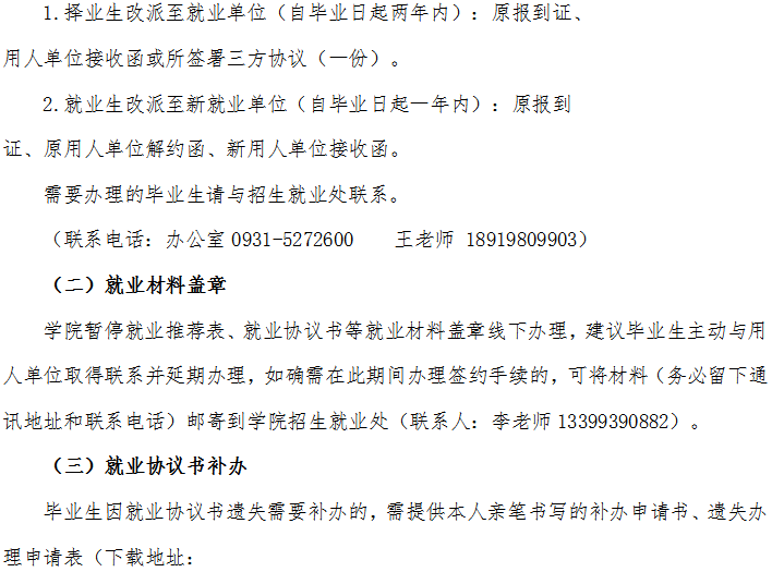 毕业生因与原单位解约需要补办就业协议书,需将原就业协议书(一式三份)、原单位开具的解约函、现单位接收函、违约办理申请表(下载地址:http://jiuye.bowenedu.cn/W/HdContentDisp-18-172-2016516-668539.htm)一并邮寄到学院招生就业处(联系人:李老师13399390882)。学院招生就业处收到材料之日起,在学院就业服务网公示一周后,补发新的就业协议书至毕业生。