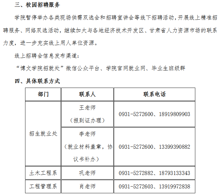 我院“博文学院招就处”微信公众平台、学院官网就业网、毕业生班级群等上传就业创业相关政策及知识、就业手续办理流程等资讯,后续开展线上就业政策宣讲会、求职技能培训及公务员招录、事业单位报考、选调生遴选等各类信息。