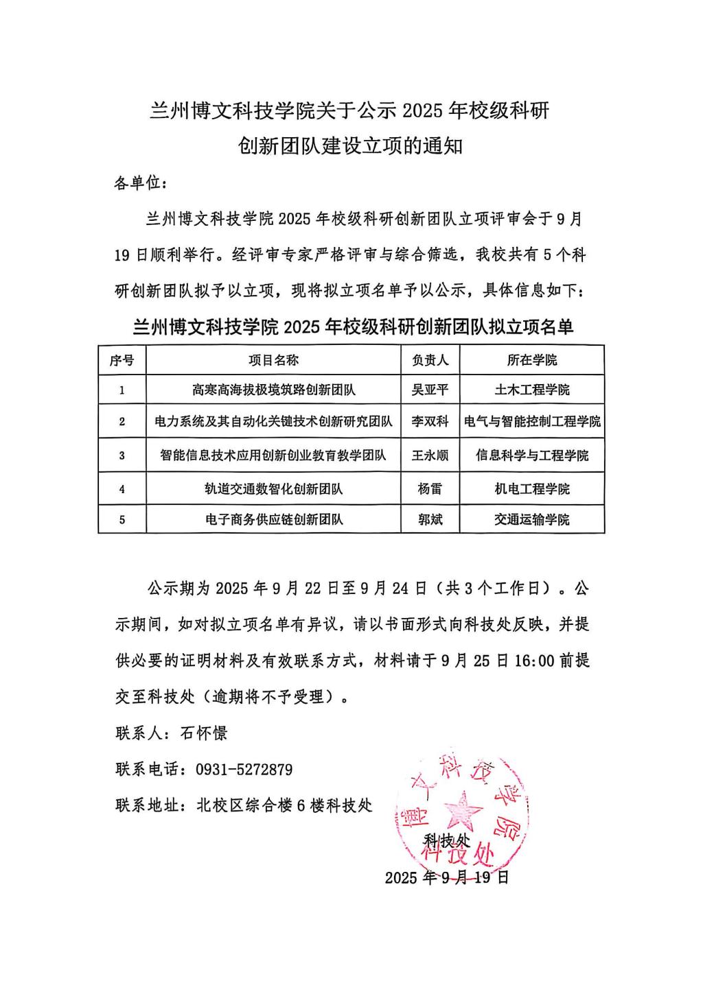 BEAT365官网关于公示2025年校级科研创新团队建设立项的通知