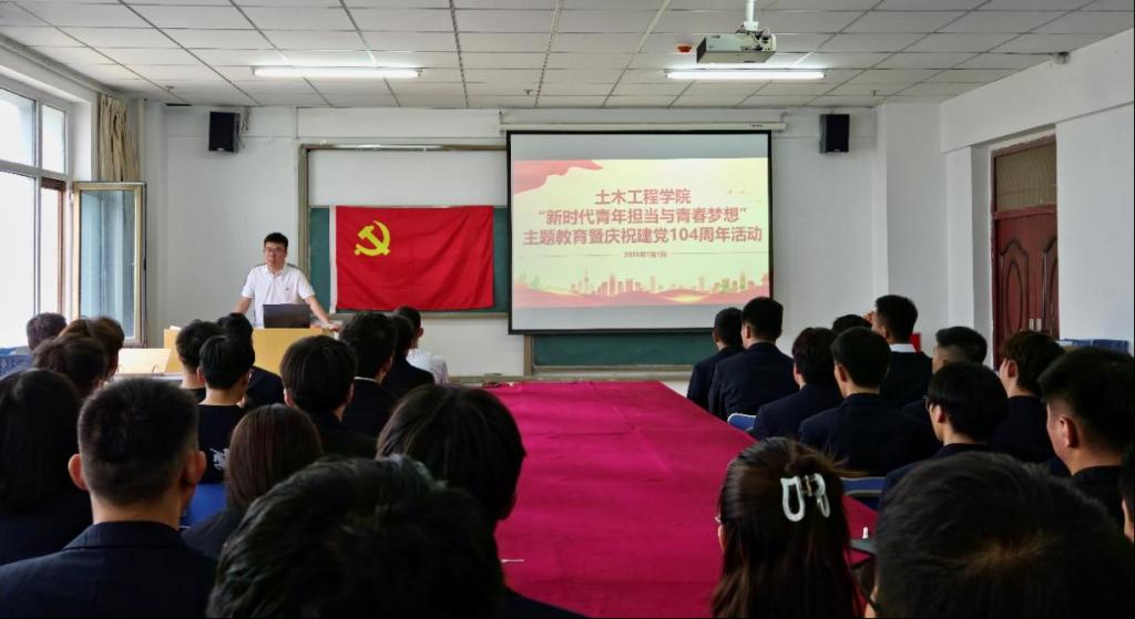 为深入学习贯彻党的二十大精神,引导青年学子传承红色基因,践行伟大建党精神,勇担时代使命,以青春之我铸就青春之中国,在中国共产党成立104周年之际,2025年7月1日,土木工程学院在综合教学楼1106室开展“新时代青年担当与青春梦想”主题教育暨庆祝建党104周年专题活动,通过形式多样、内涵丰富的活动,传承红色基因,凝聚奋进力量。土木工程学院党委副书记,副院长巩岩,教工党员代表出席活动,全体学生党员到场参加活动,活动由土木工程学院教工党员张洁雅主持。