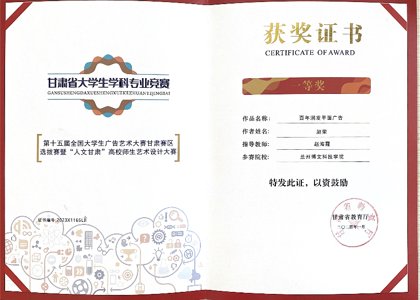 赵海霞老师获得“第15届全国大学生广告艺术大赛甘肃赛区选拔赛暨‘人文甘肃’高校师生艺术设计大赛”优秀指导老师荣誉。