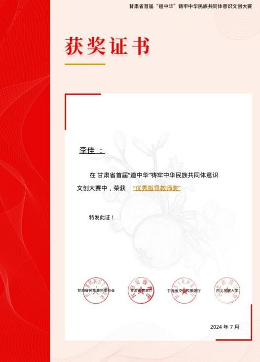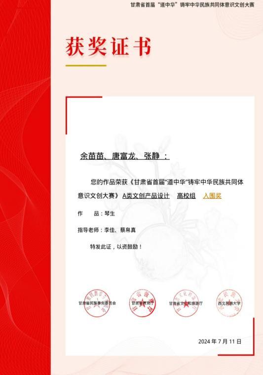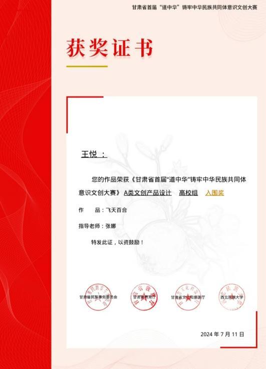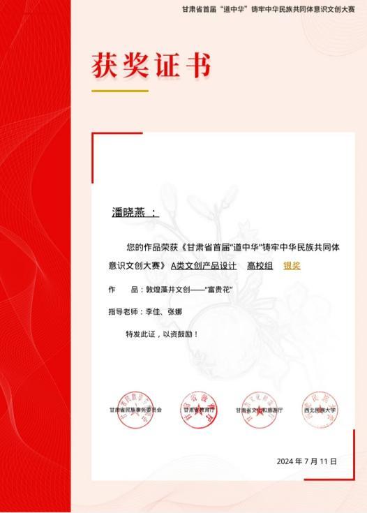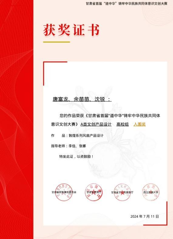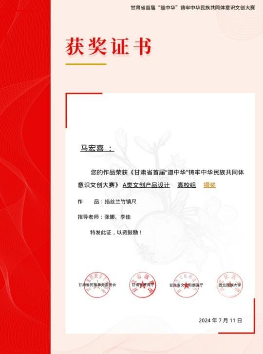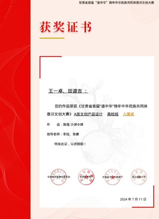 该赛事由中共甘肃省委统战部指导,甘肃省民族事务委员会、甘肃省教育厅、甘肃省文化和旅游厅、西北民族大学主办,西北民族大学美术学院承办,全省多所学校参加。我院参赛团队在初审、复审、终审三轮评审工作中,凭借扎实的专业知识、创新的思维和出色的团队协作能力获得银奖1项、铜奖1项,入围奖8项。张娜、李佳老师获得“优秀指导教师奖”,组委会为我校颁发了“BEAT365官网“道中华”文创大赛最佳组织奖”。