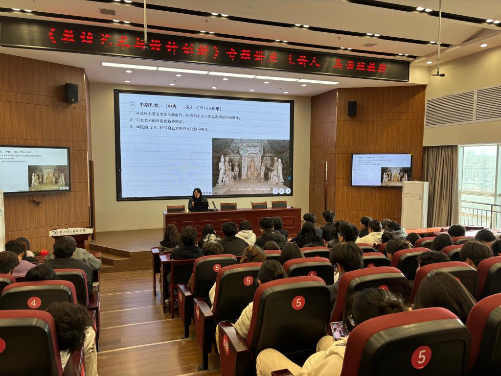 结合自身主持的国家社科基金项目研究经历,马教授向在场师生分享了从理论研究到设计实践的转化经验,从壁画色彩体系的现代提取、构图逻辑的创新应用,到文创产品的研发设计与市场推广,完整呈现了跨学科创新的实施流程。“传统文化是设计创新的不竭源泉,而跨学科思维则是激活这一源泉的关键钥匙。”她勉励师生们要敢于突破创作边界,在传统与现代的碰撞中寻找创新灵感。